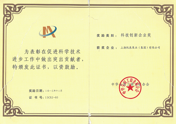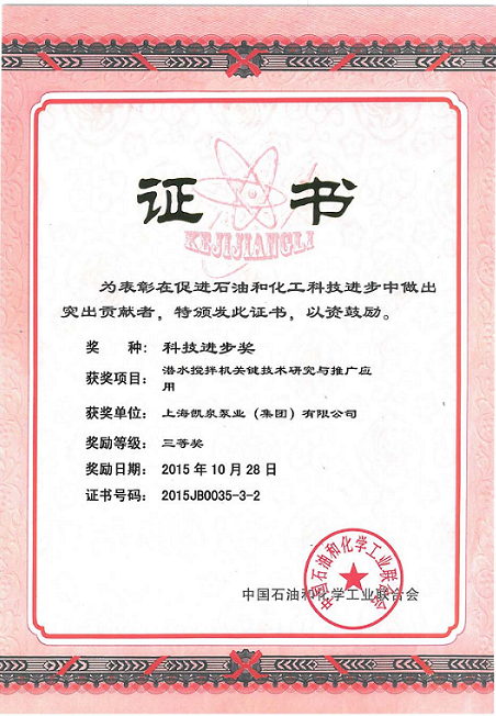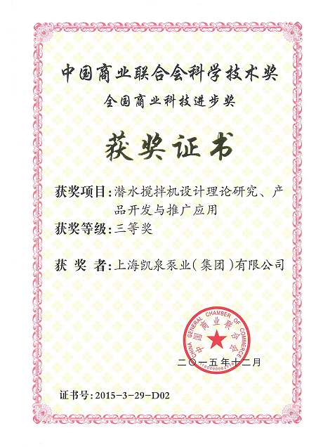 集团潜水搅拌机设计理论研究、产品开发与推广应用荣获“全国商业科技进步三等奖”