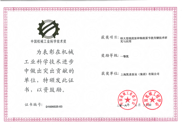 集团特大型混流泵和轴流泵技术研发与应用荣获“中国机械工业科学技术奖一等奖”