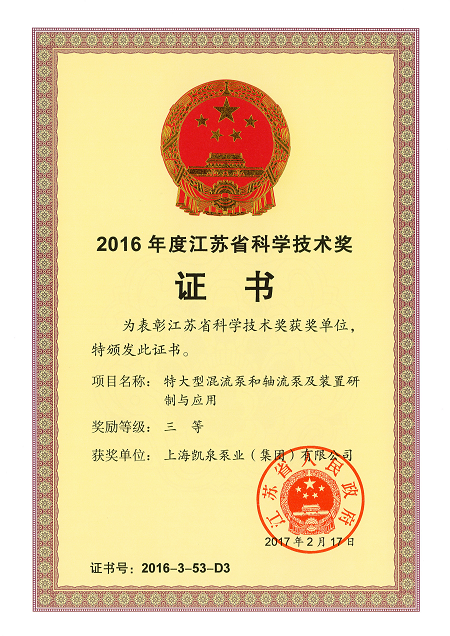 集团特大型混流泵和轴流泵及装置研制与应用荣获“江苏省科学技术三等奖”