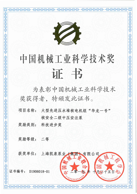 集团大型先进压水堆核电机组“华龙一号”核安全二级中压安注泵荣获“中国机械工业科学技术奖二等奖”