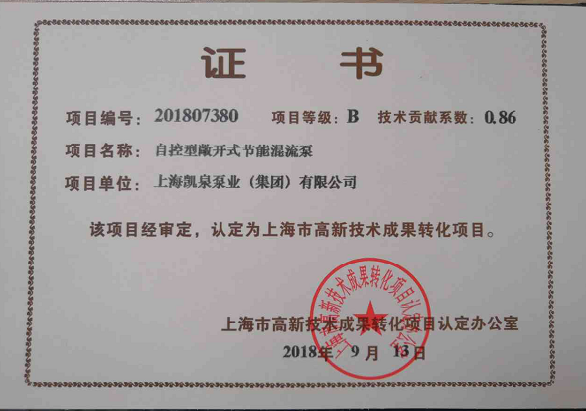 集团自控型敞开式节能混流泵被认定为“上海市高新技术成果转化项目”