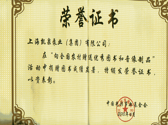 集团“向全国农村赠送优秀图书和音像制品”捐赠荣誉证书