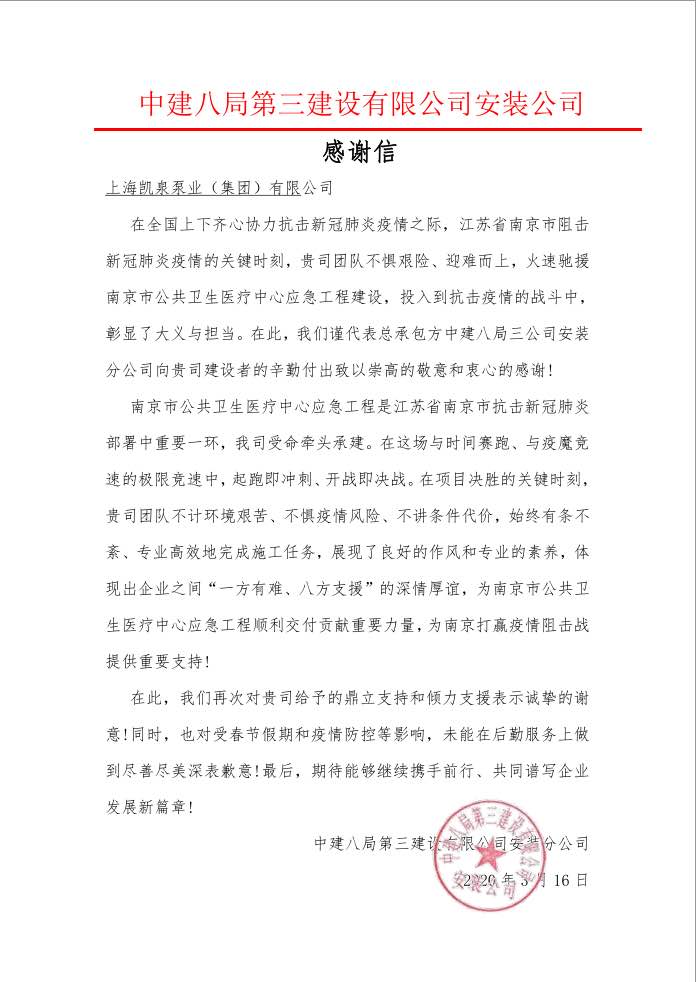 集团驰援抗疫收获中建八局第三建设感谢信