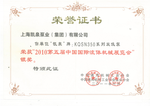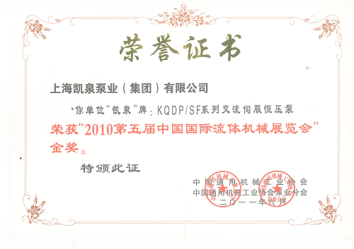 KQDP_SF系列交流伺服恒压泵荣获_2010第五届中国国际流体机械展览会_金奖313
