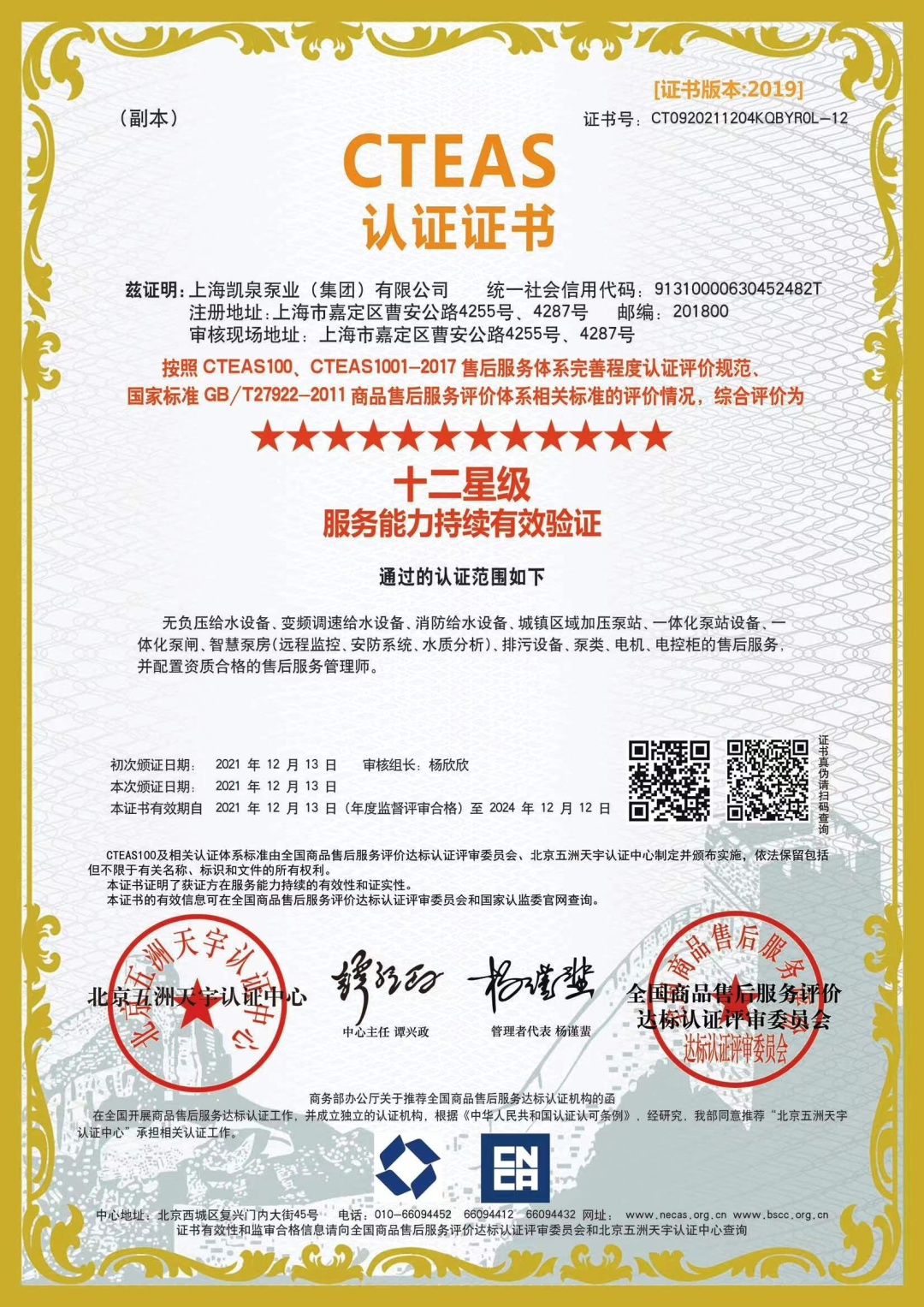 集团通过CTEAS售后服务体系十二星认证